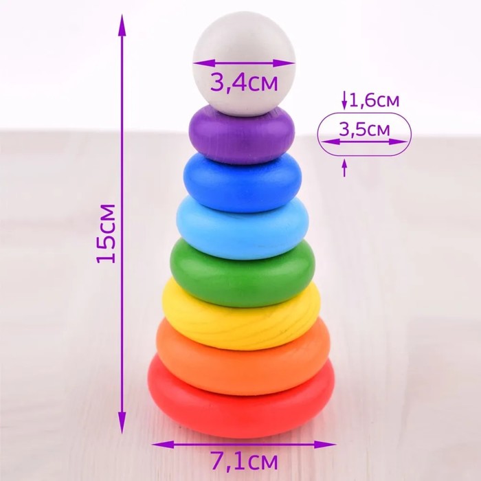 Пирамидка 8 элементов рекомендована для игр малышей с полугода (и даже ранее). Пирамидка не только развивает координацию ребёнка и логическое мышление — детали с отверстиями учат малышей находить нужные элементы по подобию форм. С помощью пирамидки можно не только развлечь малыша, но и планомерно развивать его мышление, обучать основным цветам, понятиям «больше-меньше», «одинаковый-разный».