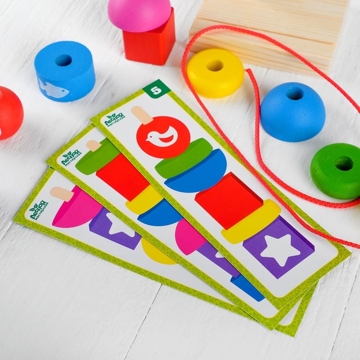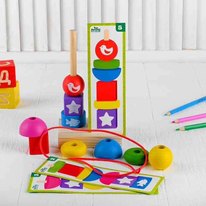 Сборка пирамидки по схемам развивает логическое мышление, внимание и пространственное восприятие. Ребёнок учится различать цвета и формы, а также тренирует координацию движений. Шнуровка добавляет элемент творчества, а возможность использовать детали для счёта делает игрушку полезной для раннего обучения.