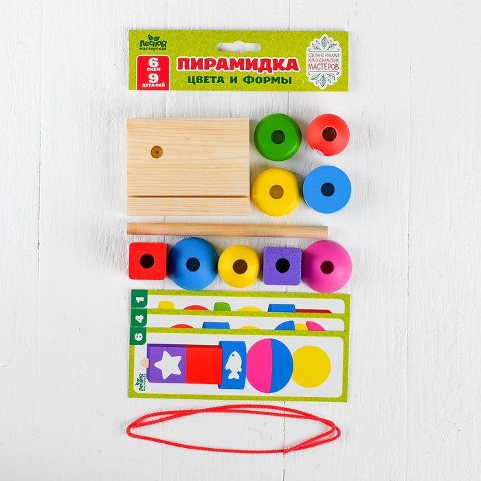 - 9 деревянных деталей для сборки пирамидки по 6 схемам.
