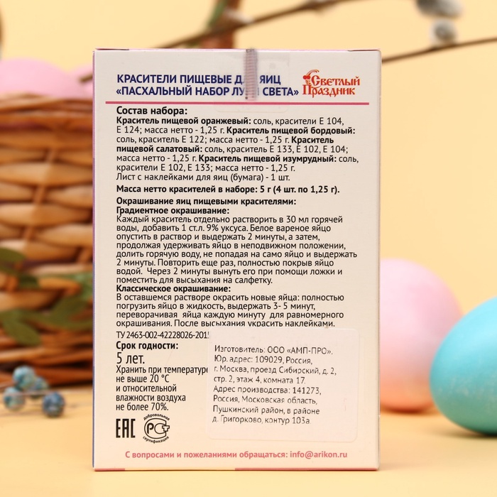 Красители пищевые для яиц "Пасхальный набор Лучи света" — это великолепный комплект, который поможет вам создать яркие и запоминающиеся пасхальные яйца! Этот набор включает в себя всё необходимое для креативного оформления яиц, позволяя каждому члену семьи погрузиться в атмосферу праздника.
