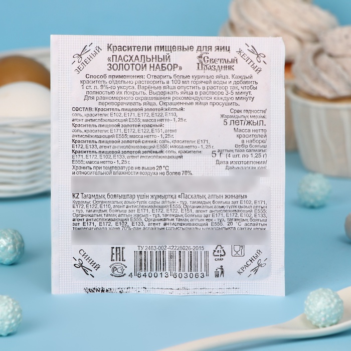 Краситель пищевой золотой желтый: соль, красители пищевые: Е102, Е171, Е172, Е122, Е110, агент антислёживающий Е555; масса нетто - 1, 25 г. Краситель пищевой золотой красный: соль, красители пищевые: Е171, Е172, Е122, Е151, агент антислёживающий Е555; масса нетто - 1, 25 г. Краситель пищевой золотой синий: соль, красители пищевые: Е171, Е172, Е133, агент антислёживающий Е555; масса нетто - 1, 25 г.Краситель пищевой золотой зеленый: соль, красители пищевые: Е171, Е172, Е102, Е133, агент антислёживающий Е555; масса нетто - 1, 25 г.