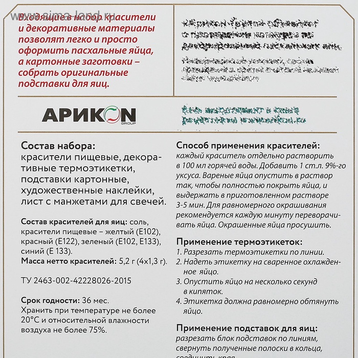 Краситель пищевой золотой желтый: соль, красители пищевые: Е102, Е171, Е172, Е122, Е110, агент антислёживающий Е555; масса нетто - 1, 25 г. Краситель пищевой золотой красный: соль, красители пищевые: Е171, Е172, Е122, Е151, агент антислёживающий Е555; масса нетто - 1, 25 г. Краситель пищевой золотой синий: соль, красители пищевые: Е171, Е172, Е133, агент антислёживающий Е555; масса нетто - 1, 25 г.Краситель пищевой золотой зеленый: соль, красители пищевые: Е171, Е172, Е102, Е133, агент антислёживающий Е555; масса нетто - 1, 25 г. Лист подставок для яиц, лист наклеек золотое сияние.