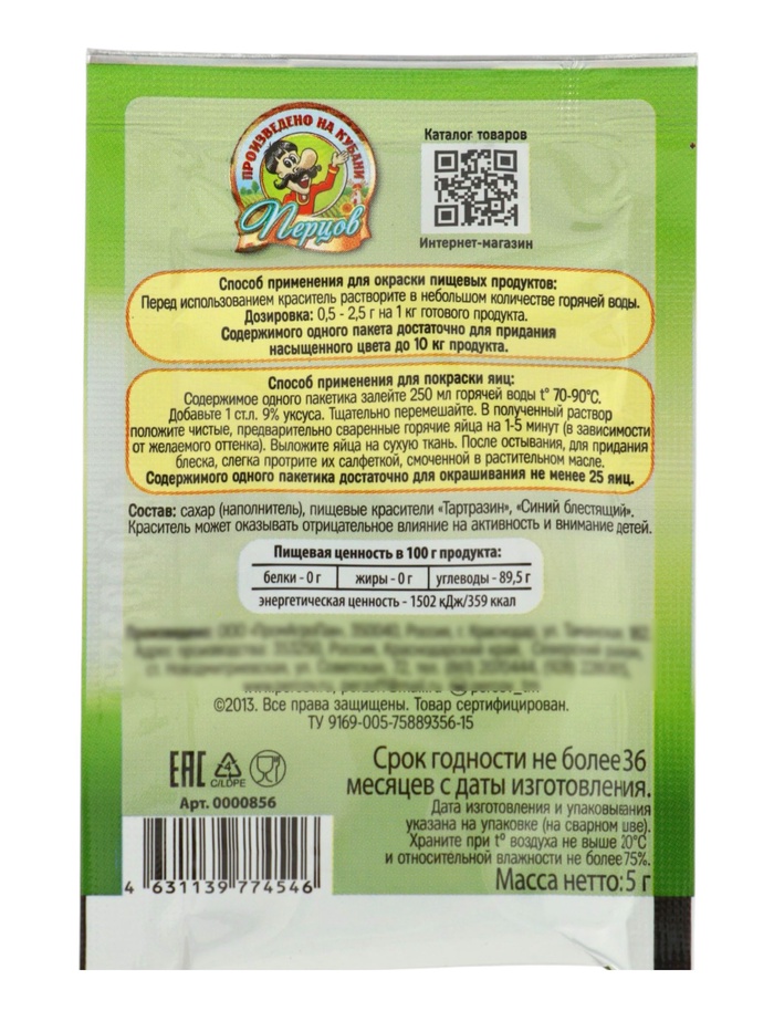 - Экономичный сухой порошок: Вес пакетика всего 5 граммов, но этого количества хватит на окрашивание 15–20 яиц. Сухая форма удобна для хранения — порошок не портится годами и занимает минимум места на кухне.