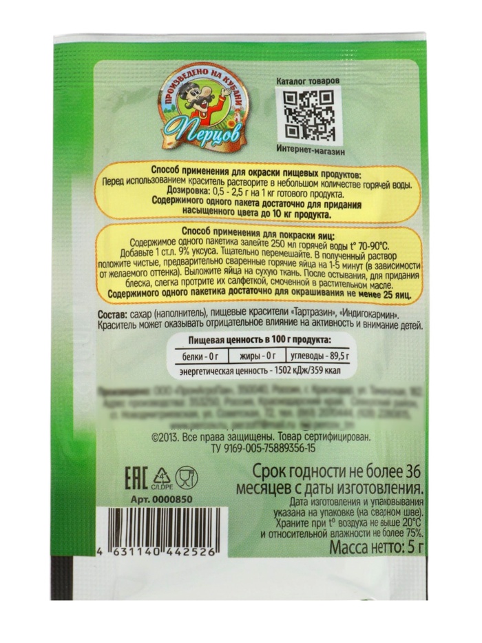 - Экономичный сухой порошок: Вес пакетика всего 5 граммов, но этого количества хватит на окрашивание 15–20 яиц. Сухая форма удобна для хранения — порошок не портится годами и занимает минимум места на кухне.