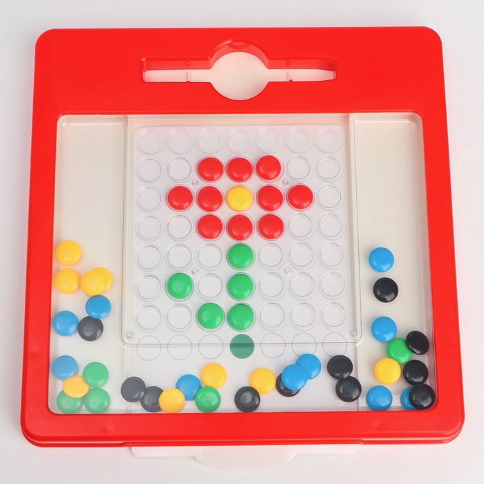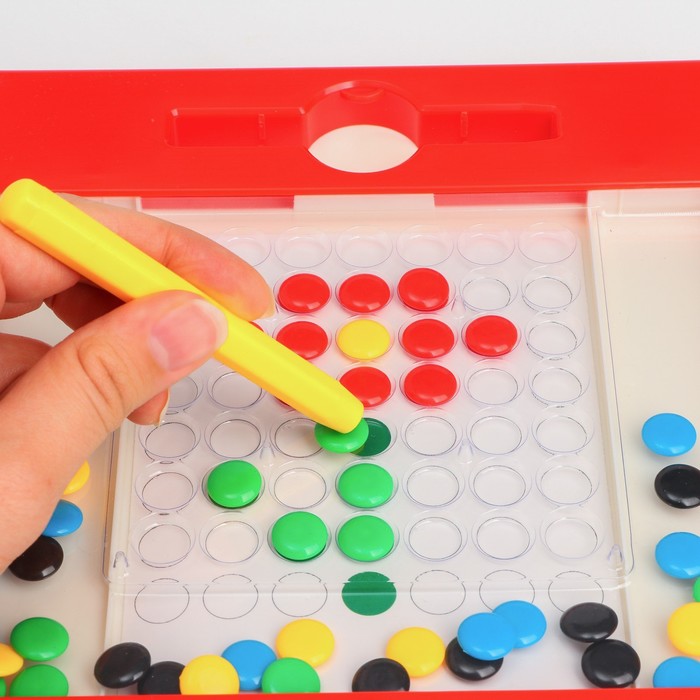 Игра «Магнитное рисование» поможет обучить ребёнка письму в дошкольном возрасте. В комплект входит планшет с разноцветными пуговками и ручка-магнит. Перемещать элементы легко – они сами слушаются палочку с намагниченным наконечником и перелетают в круглые прозрачные ячейки. Малышу не нужно прикасаться к ним руками – чтобы пуговка следовала за стилусом проведите им по понели перемещая в одно из отверстий.