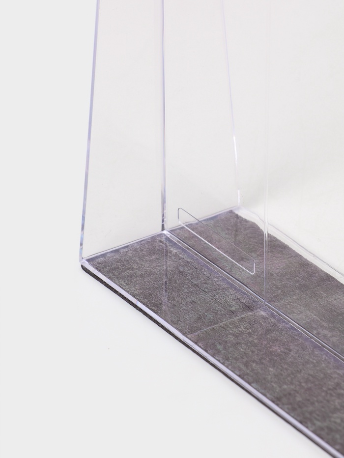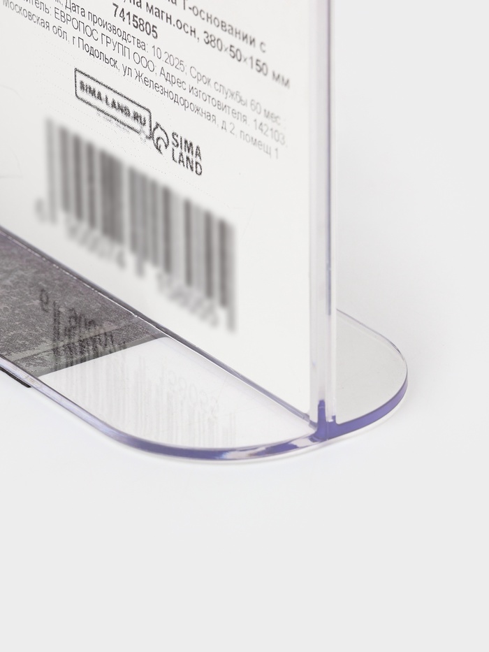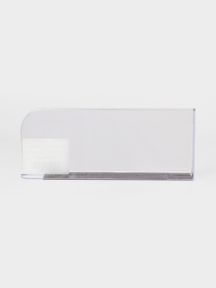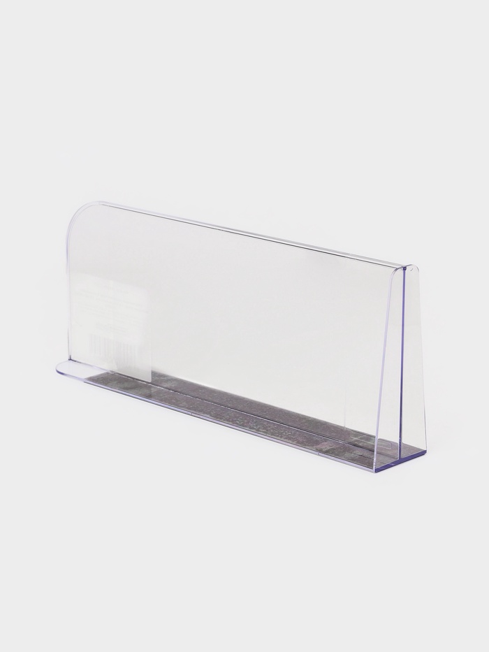 Применяется при выкладке товаров средних и крупных размеров. Ограничитель предотвращает падение товара, расположенного у преднего края полки. Материал: прозрачный ударопрочный пластик. Высота ограничителя 150 мм.