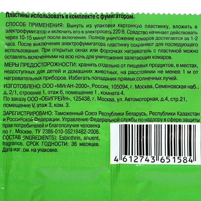 Способ применения: вынуть из упаковки картонную пластину, вложить в электрофумигатор и включить его в электросеть 220 В. Средство начинает действовать через 10-15 минут после включения. Полное уничтожение комаров достигается за 1-2 часа. После выключения электрофумигатора пластинку сохраняют для последующего использования. При открытых окнах и форточках нагреватель с пластиной можно оставлять включенным на всю ночь.
