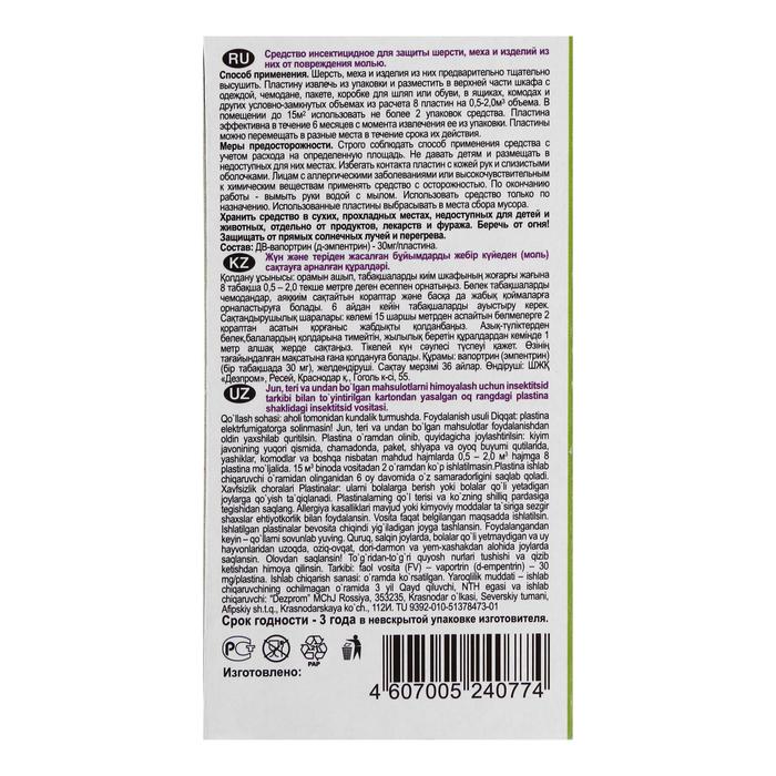 Средство инсектицидное для защиты шерсти, мкха и изделий из них от повреждения молью.Способ применения: Шерст, меха и изделия из них предварительно тщательно высушить. Вскрыть пакет, достать пластину и вешалку. Извлечь пластину из упаковки и вставить в прорези на вешалке. Подвесить вешалку с пластиной в верхней части шкафа, либо разместить пластины в чемодане, пакете, ящике для одежды из расчета 2 пластины на 0,2-0,5 м.куб. объема. В помещении до 15 м.кв. использовать не более 8 упаковок средства.Состав: ДВ - вапортрин,