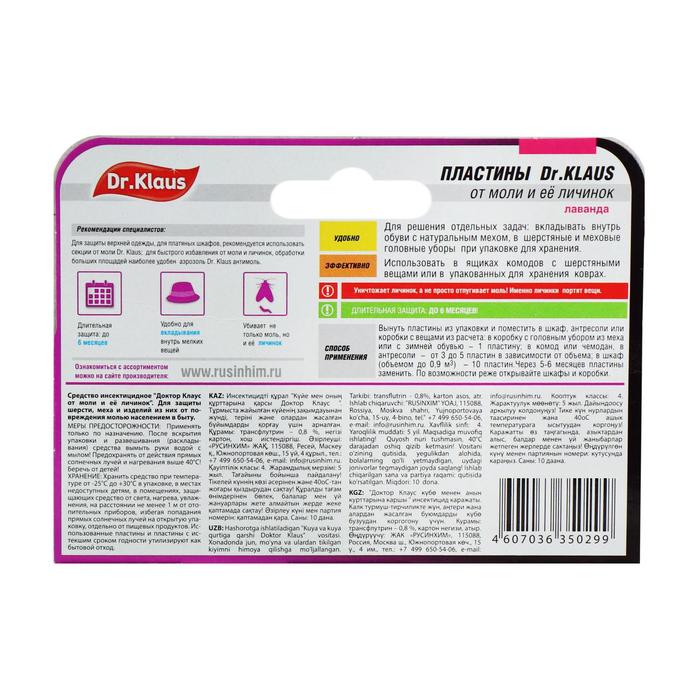 Средство "Dr.Klaus" предназначено для защиты шерсти, меха и изделий из них от повреждения молью. Уничтожает личинок, а не просто отпугивает моль. Именно личинки портят вещи. Для защиты изделий из шерсти, натурального меха, верхней одежды, ковров.