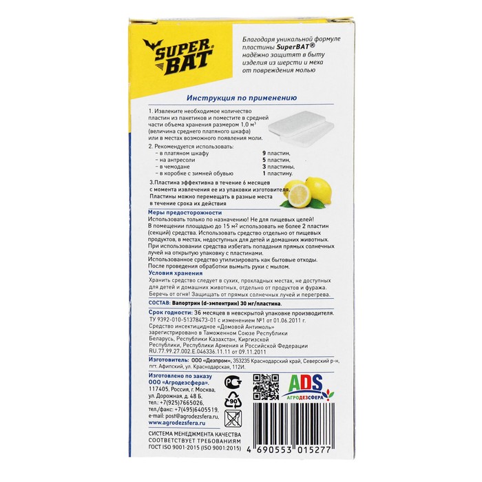 Пластины от моли SuperBAT надежно защитят в быту изделия из шерсти и меха от повреждений молью.Инструкция по применению: извлеките необходимое количество пластин из пакетиков и поместите в средней части объема хранения 1 м. куб. (величина среднего платяного шкафа) или местах возможного появления моли. Рекомендуется использовать: в платяном шкафу, на антресолях, в чемодане, в коробке с зимней обувью. Пластина эффективна в течение 6 месяцев с момента извлечения из упаковки. Пластины можно перемещать в разные места в течение срока их действия.Меры предосторожности: использовать только по назначению! Не для пищевых целей! В помещении площадью не более 15 кв.м. использовать не более 2-х пластин. Использовать средство отдельно от пищевых продуктов, в местах, недоступных для детей и домашних животных. Избегать попадания прямых солнечных лучей на открытую упаковку с пластинами. Использованное средство утилизировать как бытовые отходы. После проведения обработки вымыть руки с мылом.Действующее вещество: выпортрин (d- эмпентрин) 30 мг/пластина.