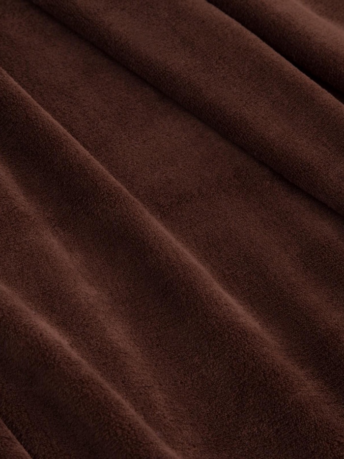 Надёжный материал с плотностью 220 г/м² сочетает навыки теплоизоляции и воздухообмена, что делает его универсальным покрывалом — не только защищающим от прохлады, но и приятным для тела даже в теплую погоду. Его легко сочетать с различным постельным бельем и интерьерными элементами благодаря классическому однотонному дизайну в коричневом цвете. Простая форма без рукавов позволяет удобно укрываться и использовать его как дополнительное одеяло или уютный шарф.