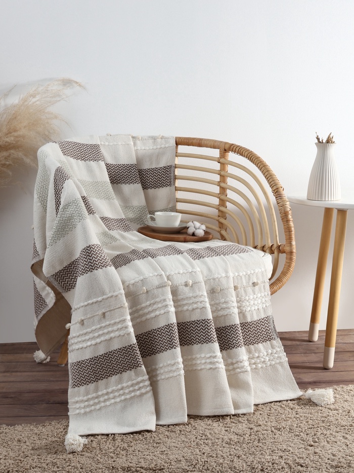Этот бежево-коричневый плед с кисточками — ваш идеальный спутник для отдыха в любое время года. Мягкий хлопковый текстиль согреет зимним вечером, станет лёгким укрытием летом и создаст уютную атмосферу в интерьере. Классический полосатый узор в ромбе с объёмным таффтингом добавляет фактурности и стиля, превращая обычный аксессуар в элемент декора.