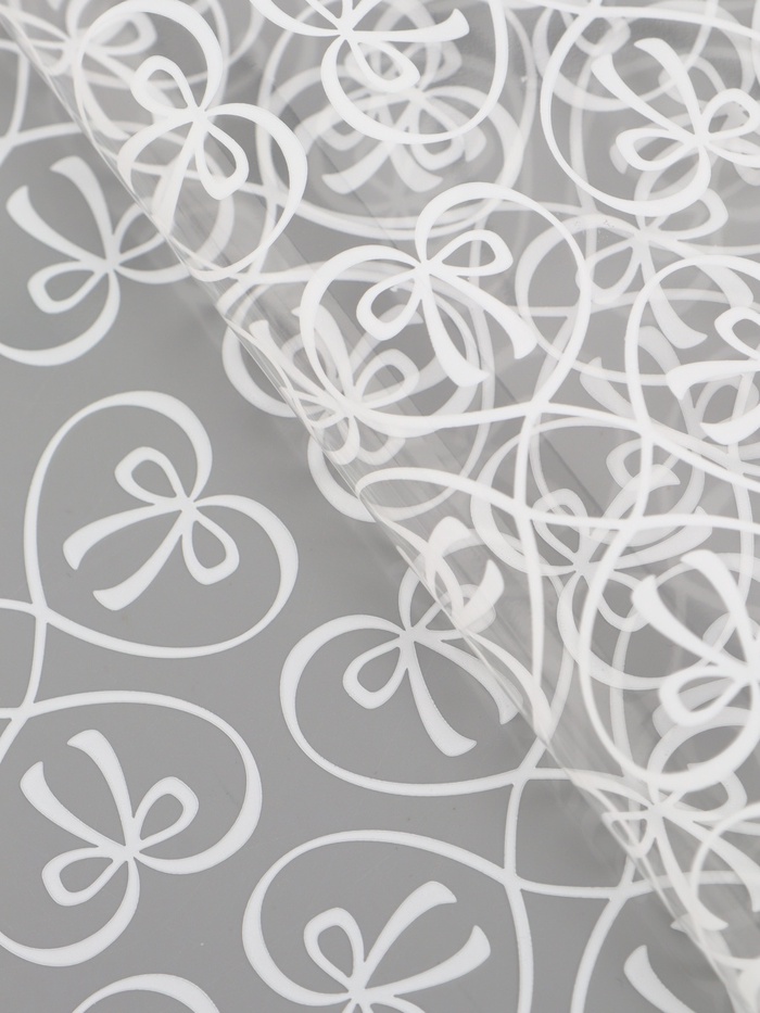 Праздничный узор для трогательных букетов. Плёнка для цветов «Бантики» 0,6×9,3 м – это прозрачный рулон с белым рисунком из сердечек и бантов. Материал толщиной 40 мкм сохраняет форму при оформлении живых цветов и подарков. Дизайн разработан для 14 Февраля, 8 Марта и других праздников, где важна романтичная подача.