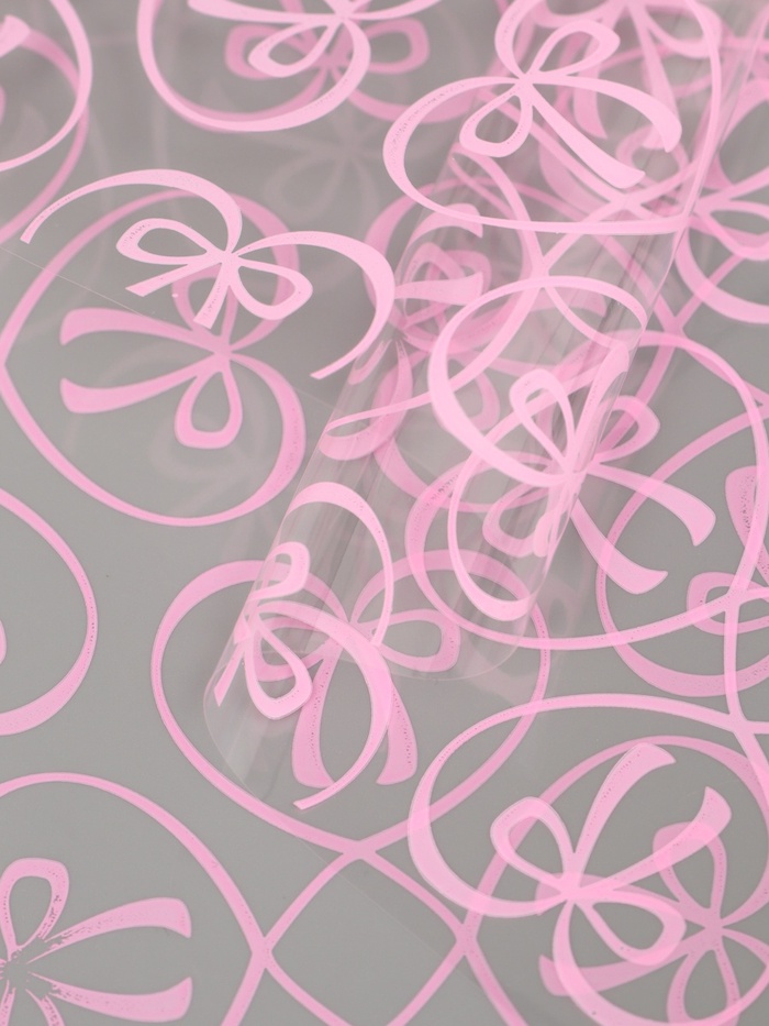- Рисунок «розовые бантики»: На прозрачной основе нанесены розовые банты и сердечки. Узор имитирует праздничное оформление и не требует дополнительных лент или декора. Краска держится плотно, не осыпается при контакте с водой и не тускнеет на свету.