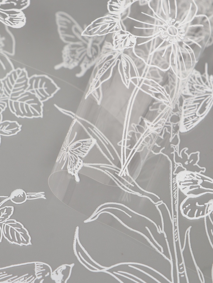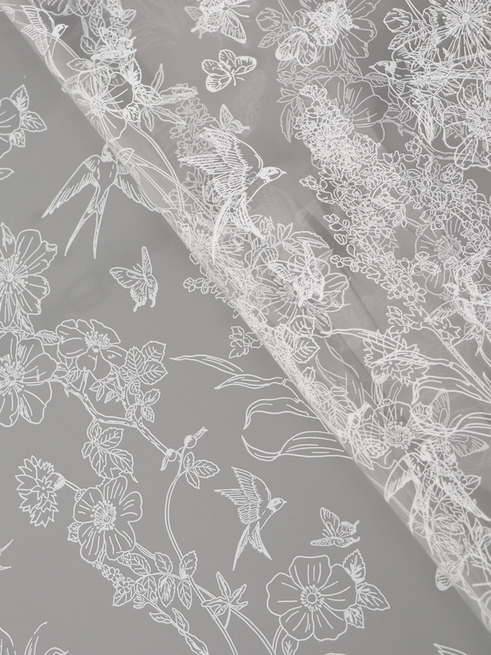 - Рисунок «Ласточки»: На прозрачной основе изображены силуэты летящих птиц, бабочек и тонкие веточки. Узор создаёт ощущение воздушности и природной лёгкости. Белая печать держится плотно, не осыпается при сгибах и контакте с водой.