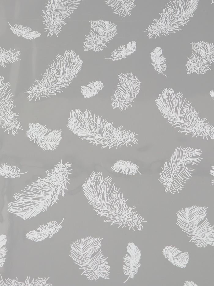 - Рисунок «Перышки»: На прозрачной основе изображены стилизованные белые перья разного размера. Узор создаёт ощущение воздушности и невесомости. Белая печать держится плотно, не осыпается при сгибах и контакте с водой.