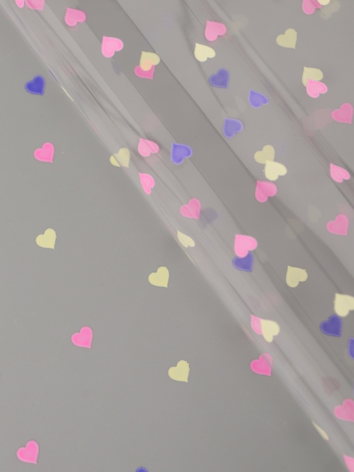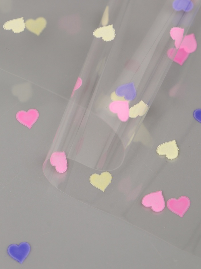 Разноцветное конфетти из сердечек для праздничных букетов. Плёнка для цветов «Сердечки конфетти» 0,7×7,6 м – это прозрачный рулон с цветным рисунком в розовых и разноцветных тонах, усыпанный множеством сердечек. Материал толщиной 40 мкм сохраняет форму при упаковке живых цветов и сувениров. Дизайн создан для 14 Февраля, 8 Марта и романтических событий.