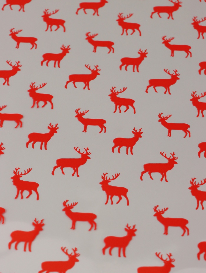 Яркий акцент новогоднего подарка! Пленка упаковочная «Северные олени» красная — это глянцевая пленка с праздничным рисунком для оформления подарков. Красный фон с прозрачными узорами создает насыщенный цвет и сохраняет видимость содержимого.