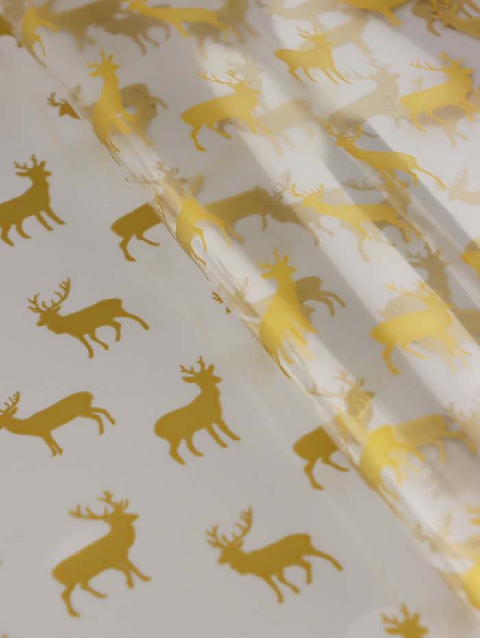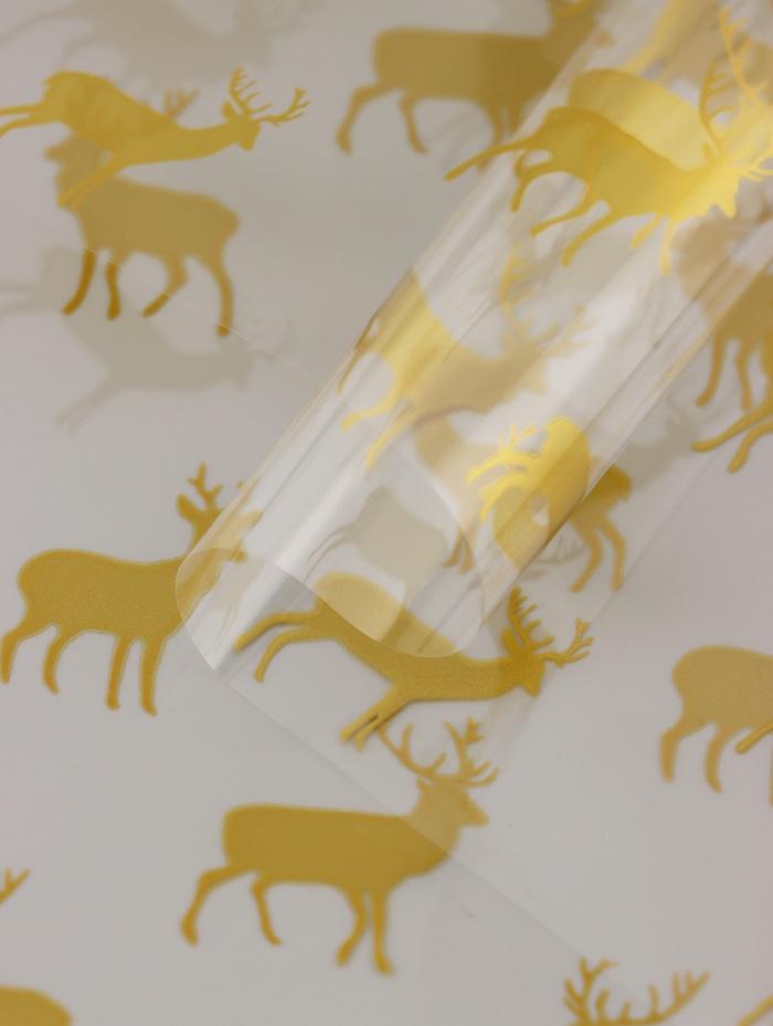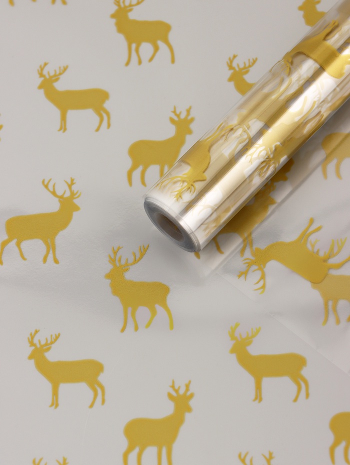 Добавьте подаркам праздничного блеска! Пленка упаковочная «Северные олени» золотая — это глянцевая упаковка с новогодним рисунком для создания нарядных подарков. Золотистый материал с прозрачными узорами сочетает насыщенный цвет и видимость содержимого.
