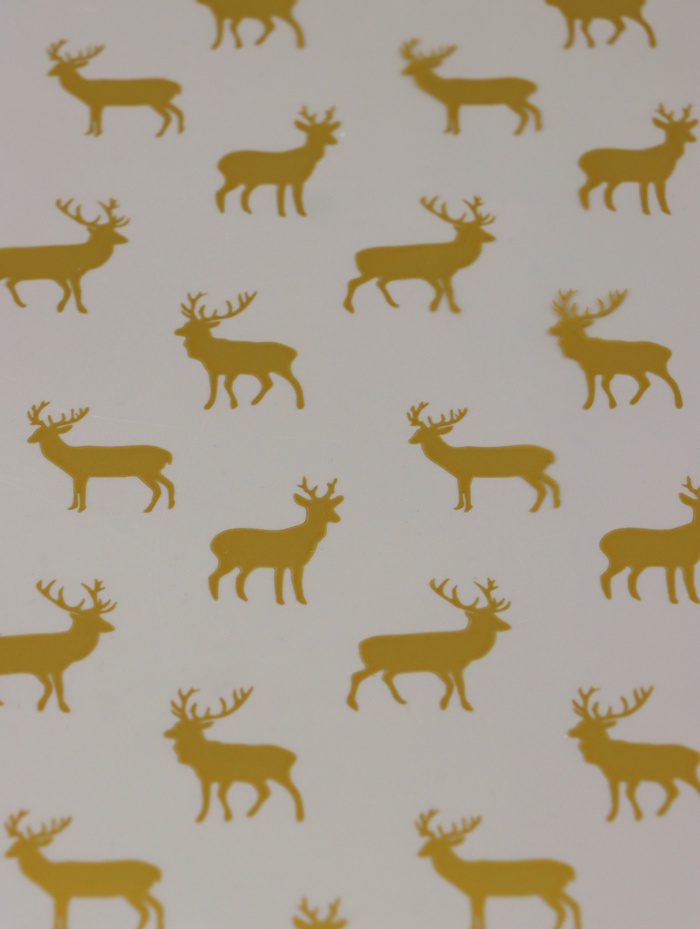 - Золотой фон с зимним сюжетом: На золотистой глянцевой поверхности выделяются прозрачные силуэты северных олени и новогодние узоры. Рисунок создает эффект дорогого и торжественного оформления.