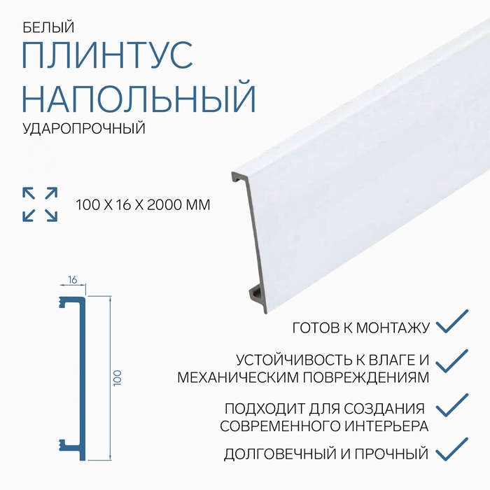 Пластиковый плинтус белого цвета отличается высокой прочностью и долговечностью. Подходит для использования в любых помещениях благодаря своей устойчивости к влаге, плесени и температурным колебаниям. Плинтус изготовлен из ударопрочного пластика, что делает его безопасным для здоровья и практичным в эксплуатации.
