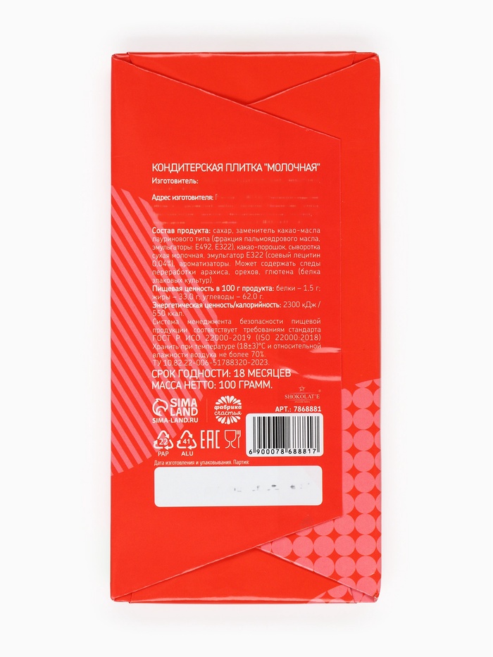 Состав: сахар, заменитель какао-масла лауринового типа (пальмоядровый стеарин, эмульгаторы Е492, Е322), какао-порошок, сухая молочная сыворотка, эмульгатор Е322 (соевый лецитин 0,4 %), ароматизаторы. Может содержать следы переработки арахиса, орехов, глютена (белка злаковых культур).