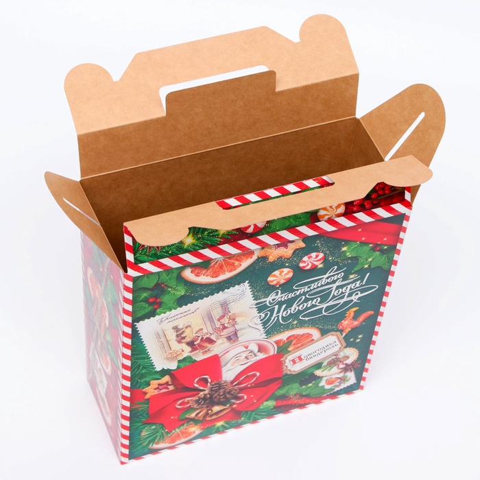 Коробка выполнена из качественных материалов, которые обеспечивают сохранность содержимого. Она имеет яркий и красочный дизайн, который отражает атмосферу Нового года.