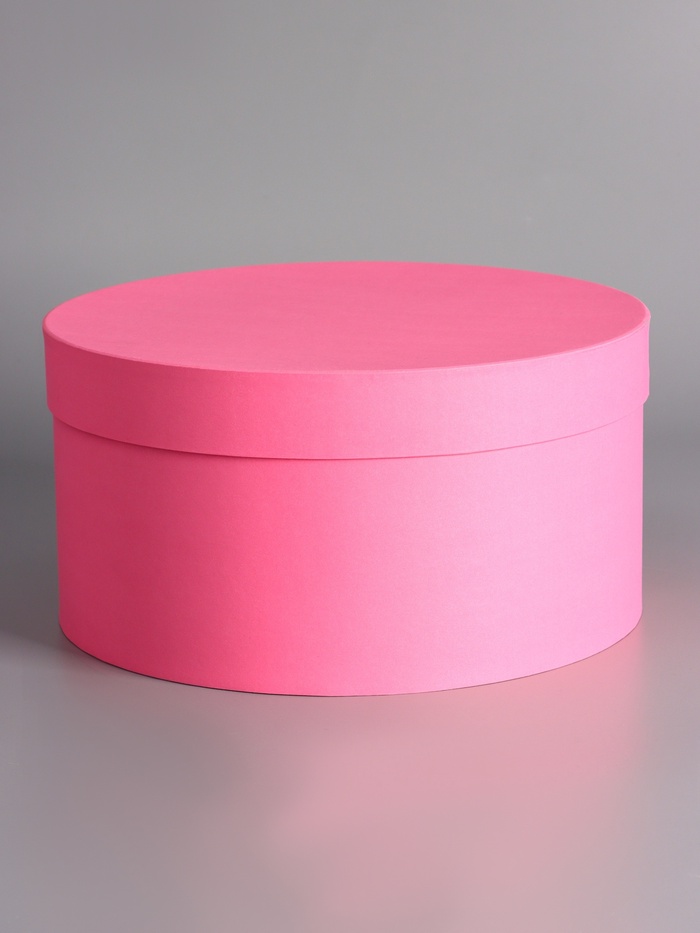 Большая круглая коробка-тубус 30×15 см выполнена из плотного розового картона. Шляпная конструкция с отдельной крышкой создает эффектную и прочную упаковку.