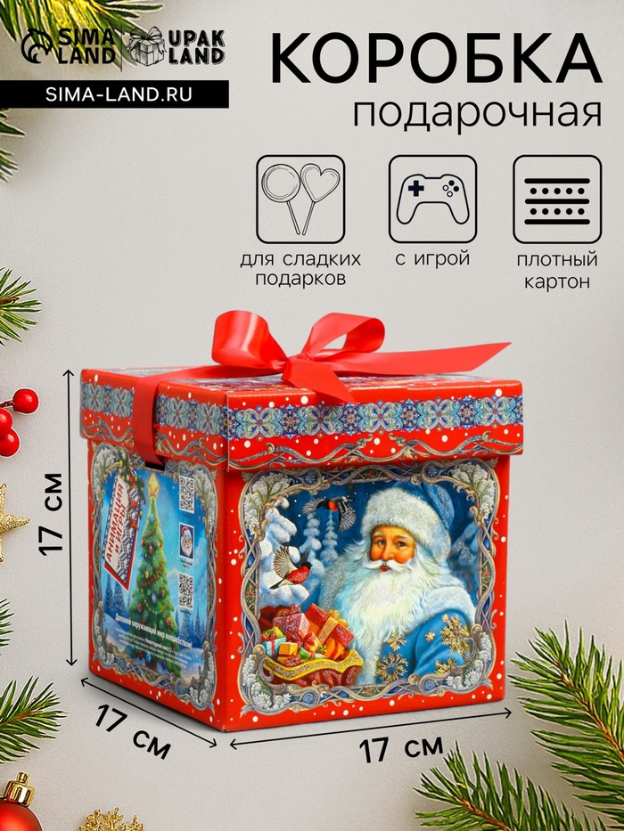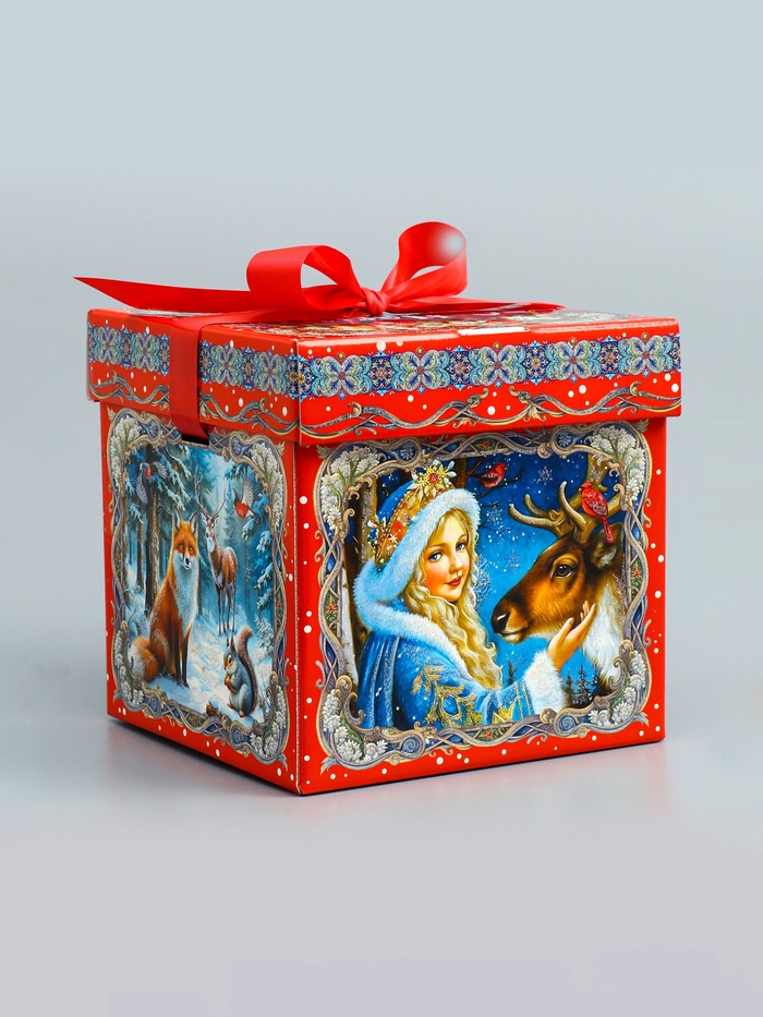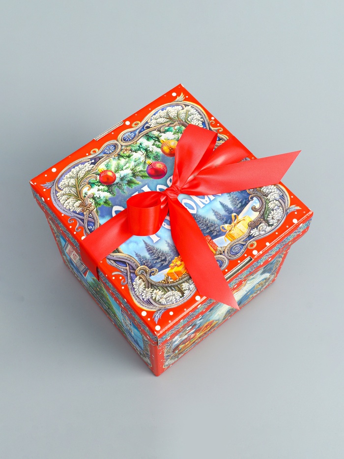 Новогоднее настроение в аккуратной упаковке! Праздничная коробка с лентой — готовое решение для небольших подарков. Её классическая форма и яркий дизайн создают праздничную атмосферу.
