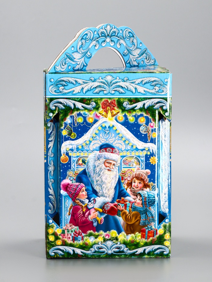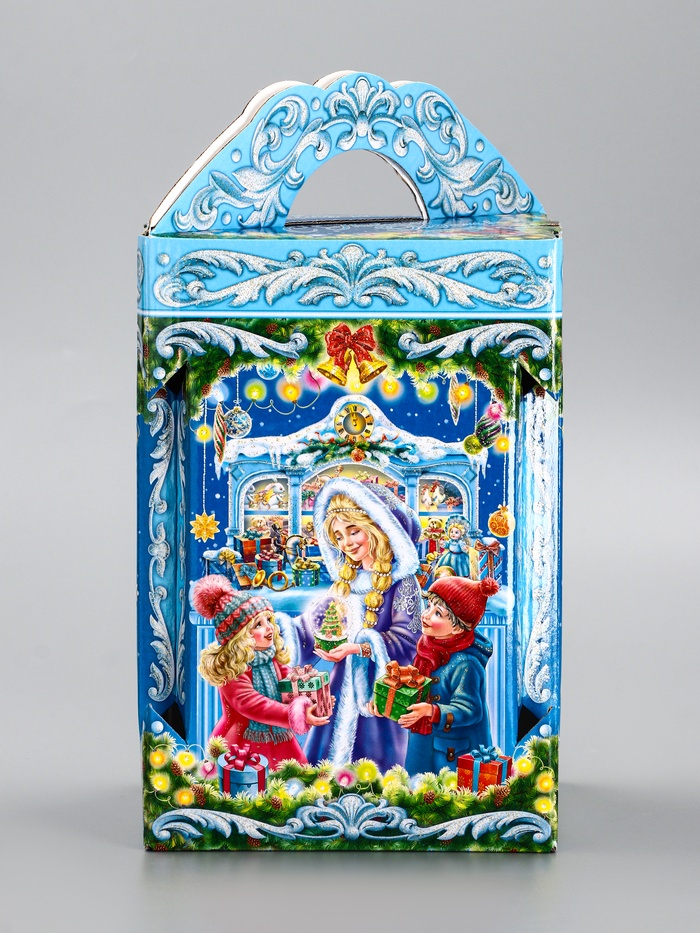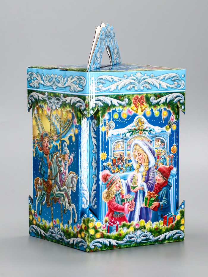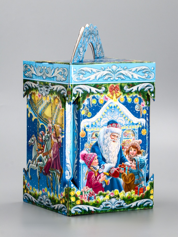 Запустите карусель новогодних чудес! Коробка «Новогодняя карусель» — это стильная упаковка для сладких подарков с символикой года Лошади. Голубой цвет с карусельными мотивами создаёт атмосферу веселья и праздничного движения.