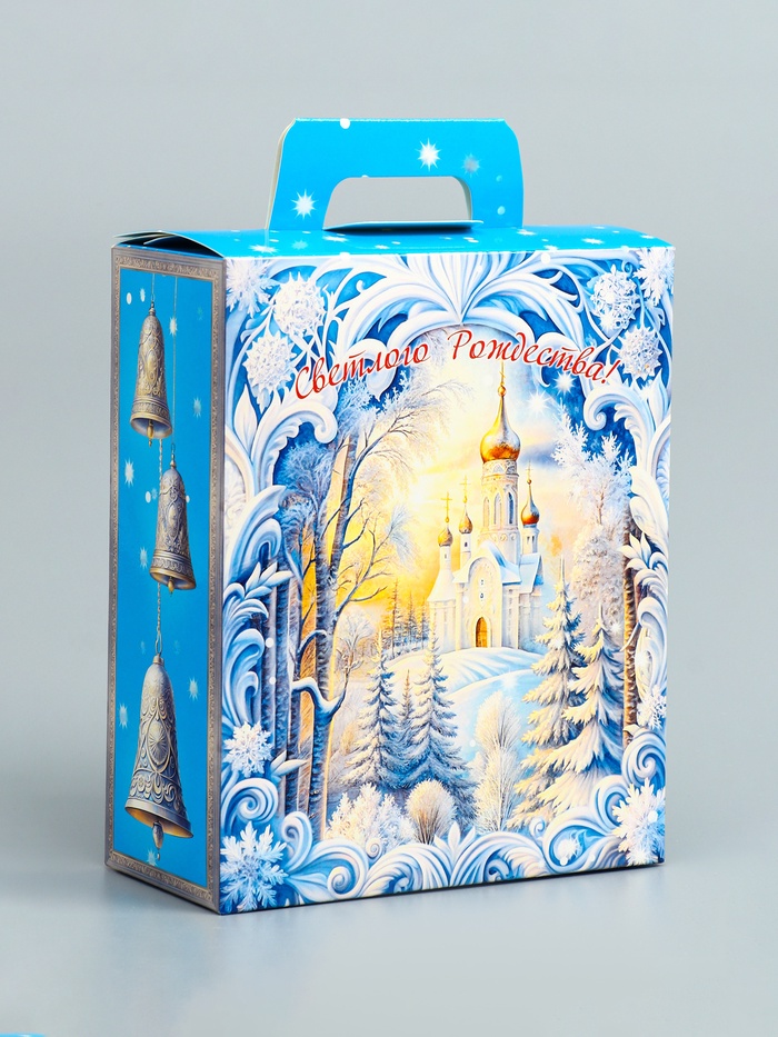 Звон колокольчиков в изящной упаковке! Новогодняя коробка «Рождественский звон» — стильное решение для праздничных подарков. Её нежный голубой цвет и зимние узоры создают атмосферу волшебства.