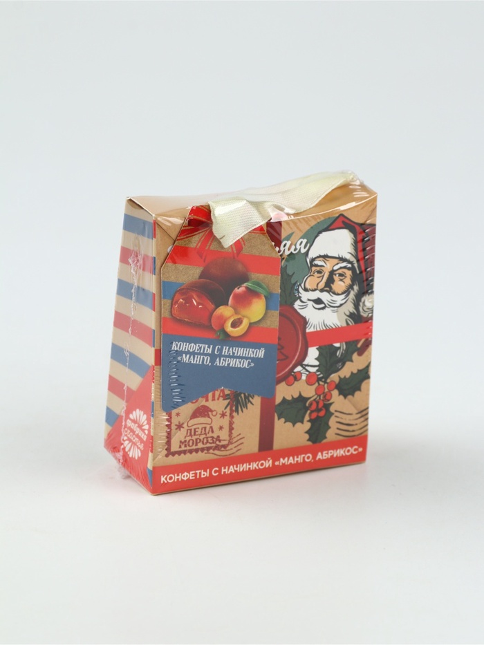 Состав: сахар, заменитель масла какао (масло пальмоядровое рафинированное, дезодорированное, фракционированное, гидрогенизированное), сыворотка молочная сухая, какао-порошок, эмульгаторы (лецитин Е322, Е476), начинка: сахар, жир специального назначения (масла растительные рафинированные, дезодорированные, модифицированные), сыворотка молочная сухая, мальтодекстрин, порошок манго сублимированный, ароматизатор натуральный «Манго», краситель пищевой – куркумин.