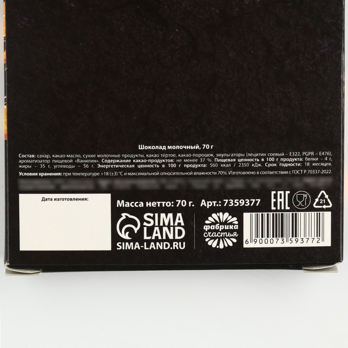Состав: сахар, какао-масло, сухие молочные продукты, какао тёртое, какао-порошок, эмульгаторы (лецитин соевый – Е322, PGPR – Е476), ароматизатор пищевой «Ванилин». Содержание какао продуктов – не менее 37 %.