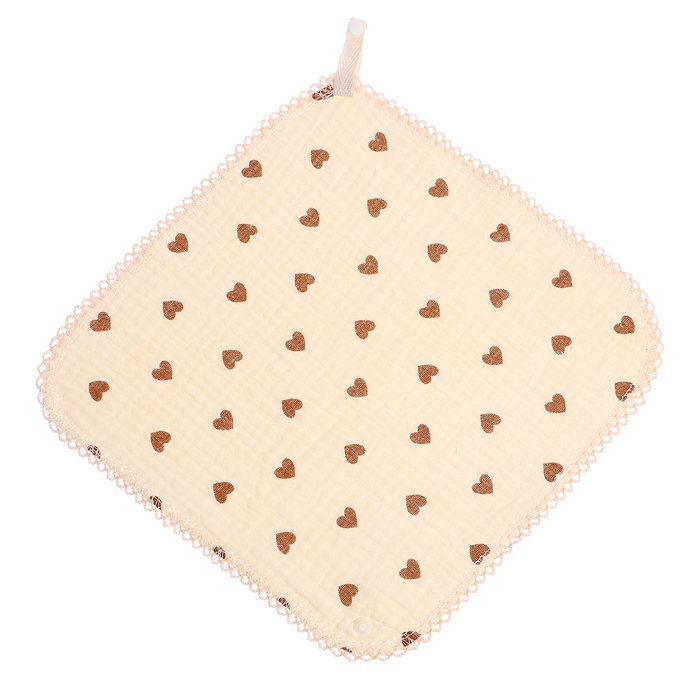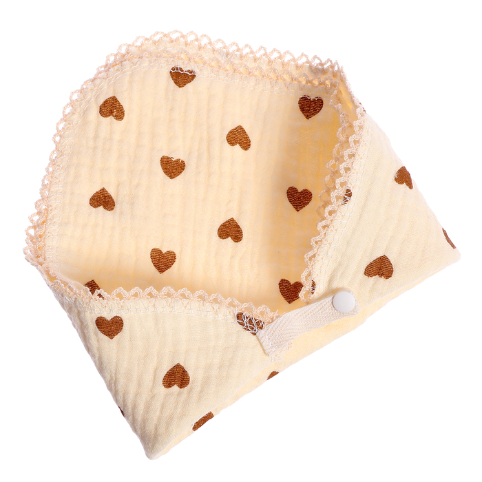 - Муслиновый слюнявчик — двухсторонний, с регулируемыми пуговичками. Его можно использовать как косынку. Милые сердечки обязательно понравятся малышу.