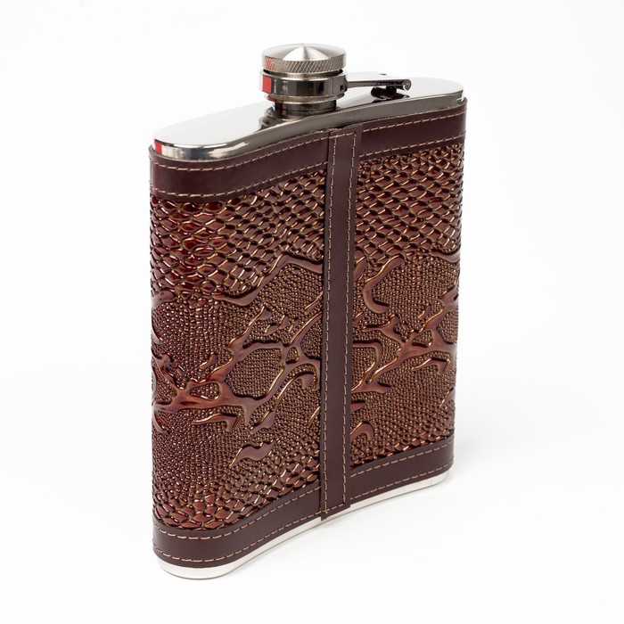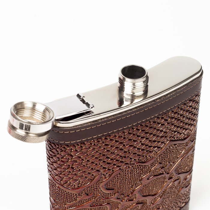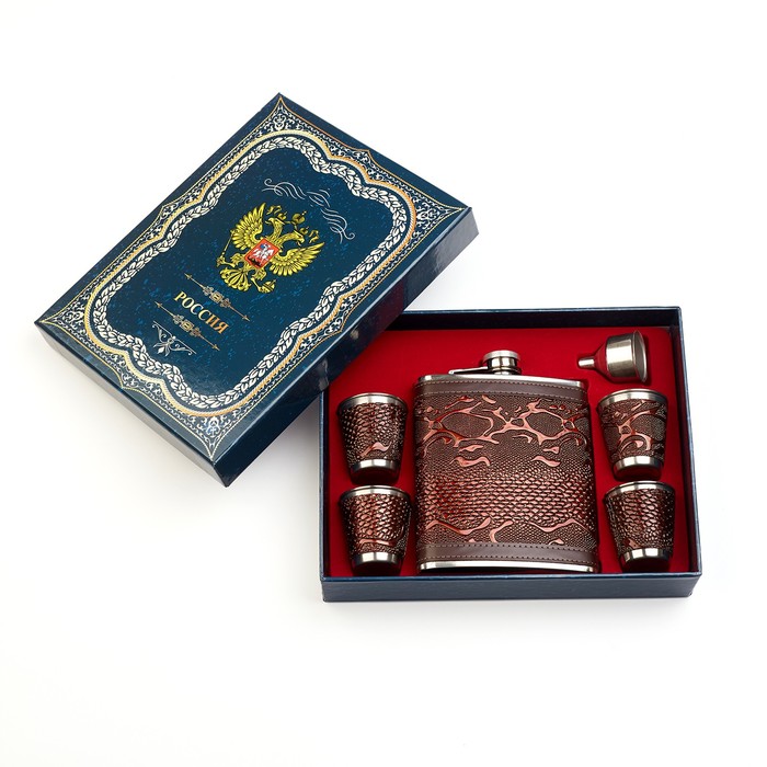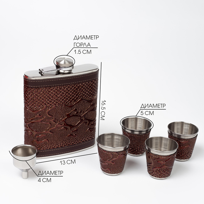 Подарочный набор 6 в 1, фляжка 540 мл, 4 стопки по 75 мл, воронка, нержавеющая сталь, экокожа, коричневый