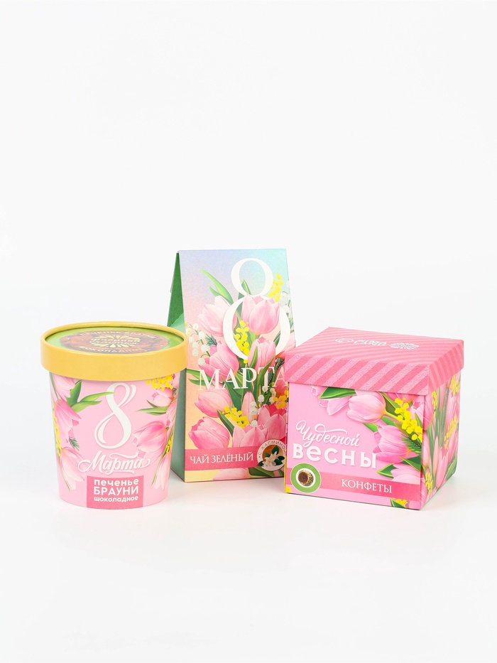 Подарочный набор «8 марта», чай зелёный со вкусом жасмина 50 г., печенье брауни 120 г., конфеты с шоколадной начинкой 110 г.