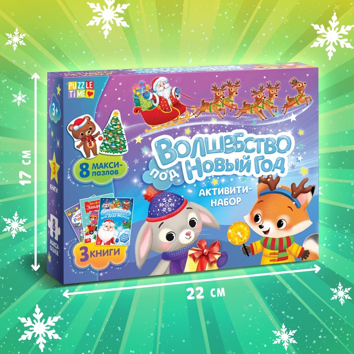 - Внутри красочной коробочки вы найдёте 8 макси-пазлов и 3 книги новогодней тематики.