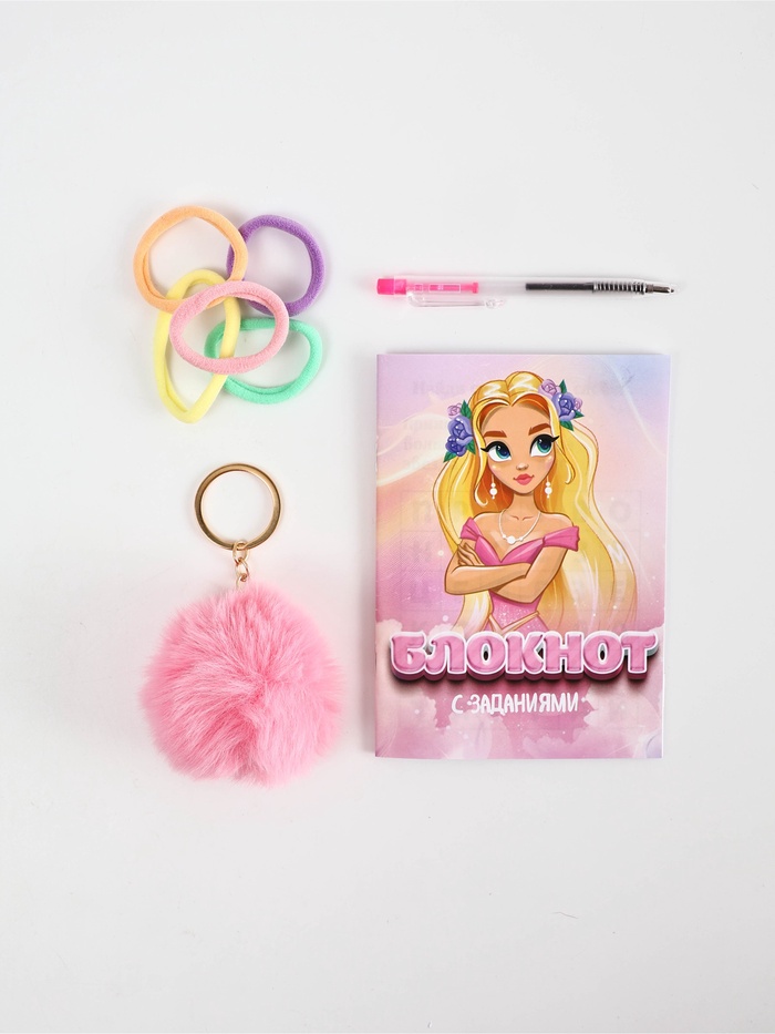 Подарочный набор: блокнот А6, 8 л. Резиночки 10шт, брелок-пушистик, мини ручка "Принцесса" 1089182