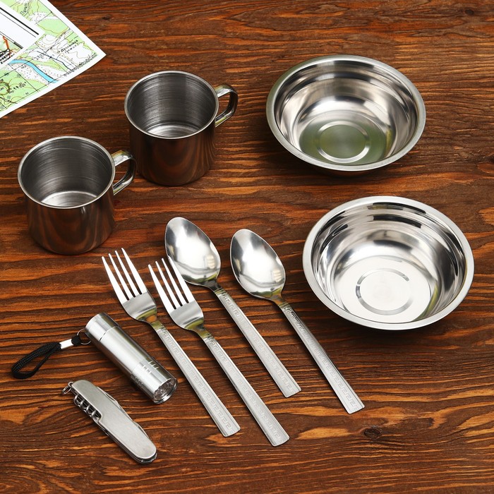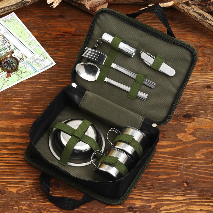 Набор для пикника с сумкой — идеальное решение для комфортного отдыха на природе. В комплект входят 10 предметов: две тарелки, две кружки, две ложки, две вилки, фонарик и мультитул.