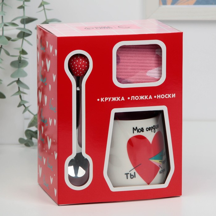 Подарочный набор «Мое сердце», кружка с крышкой 350 мл, ложка, носки 36-39 р-р.