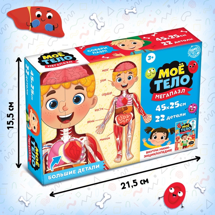 Мегапазл «Моё тело» доступно и наглядно покажет малышу, как устроен организм человека и прокачает его эрудицию. Маленький исследователь узнает, как выглядят органы и для чего они нужны. В комплекте 22 большие детали мозаики и красочная мини-энциклопедия, которые интересно изучать. Подарите этот набор малышу, чтобы порадовать его и расширить кругозор.