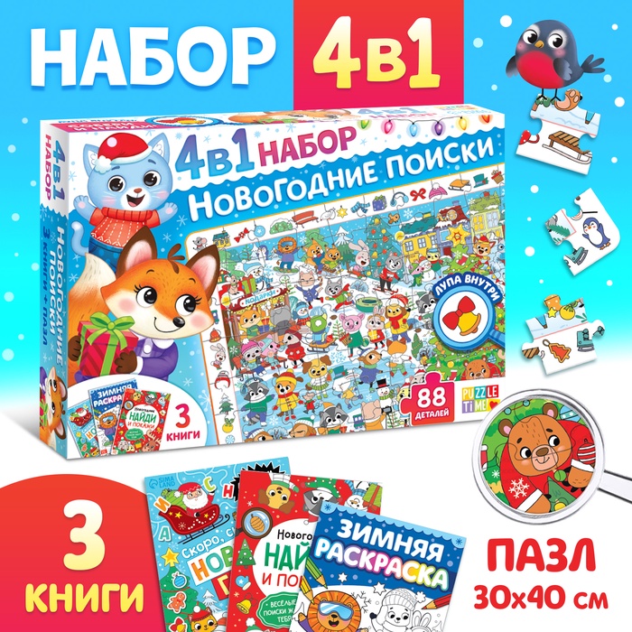 - Книга «Новогодние найди и покажи» содержит занимательные задания на поиск и тренировку внимания. К книге прилагается лупа.
