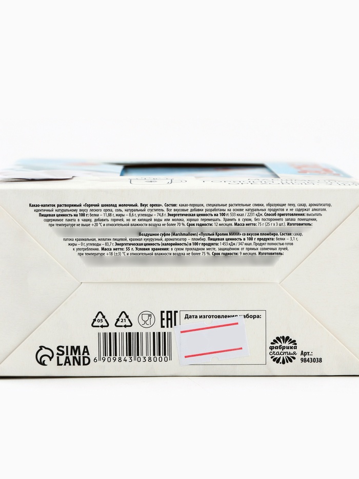 Состав: сахар, заменитель молочного продукта (патока кукурузная, растительное масло, казеинат натрия), комплексная пищевая добавка (сироп глюкозы, кокосовое масло, казеинат натрия, стабилизатор – фосфат калия), какао-порошок, загуститель – гуаровая камедь, соль, ароматизатор.