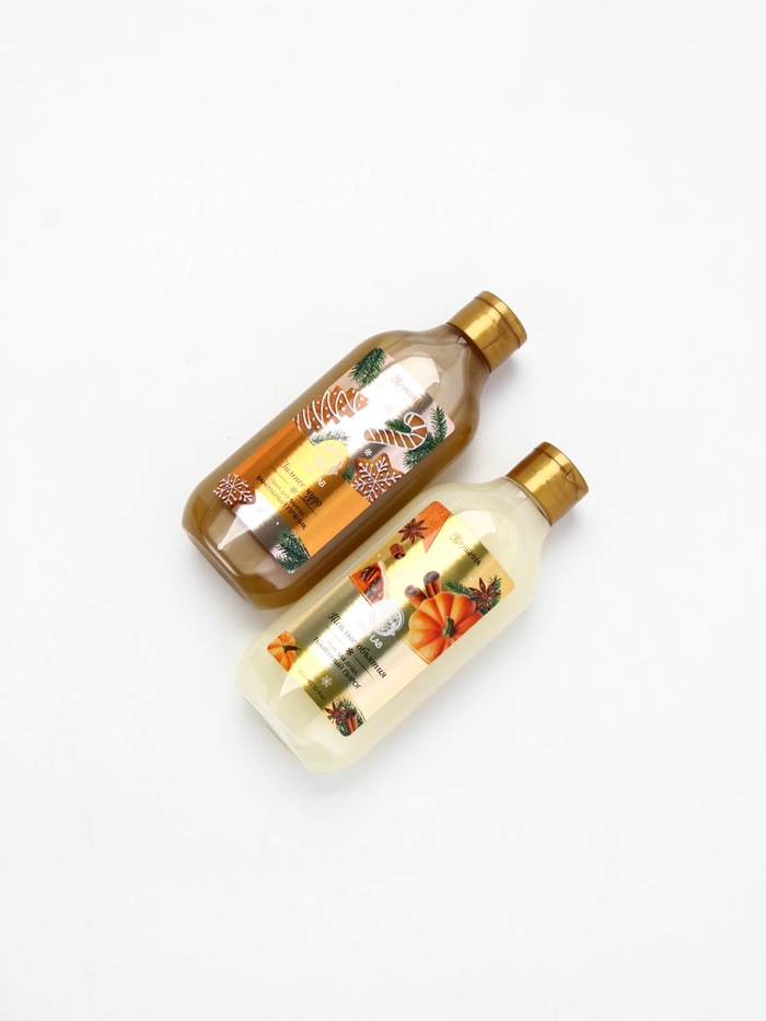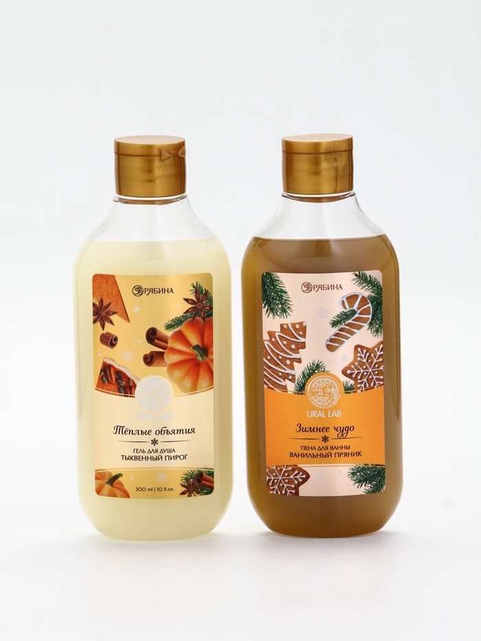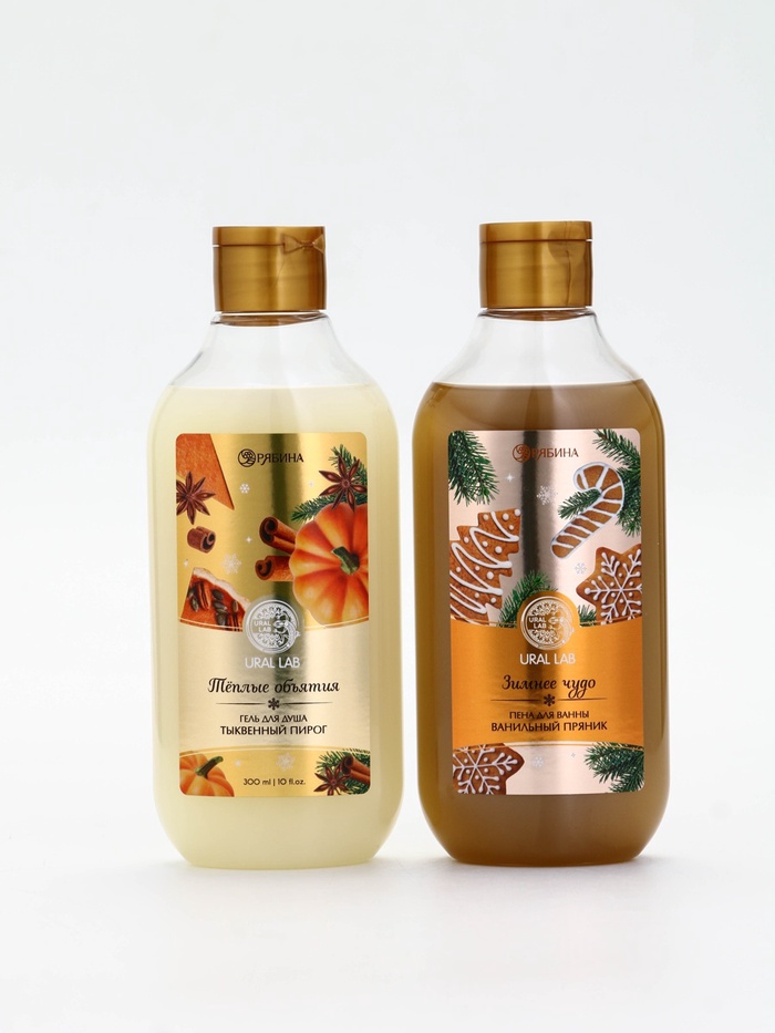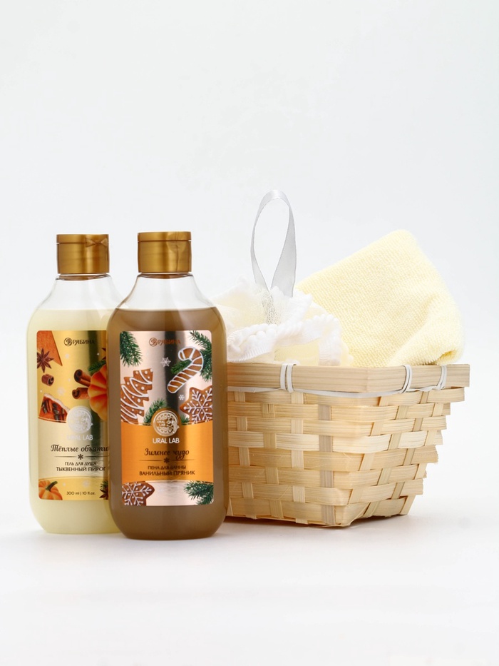 Подарочный набор новогодний в деревянной корзине: гель для душа, пена для ванны и полотенце, аромат тыквенный пирог и ванильный пряник, URAL LAB