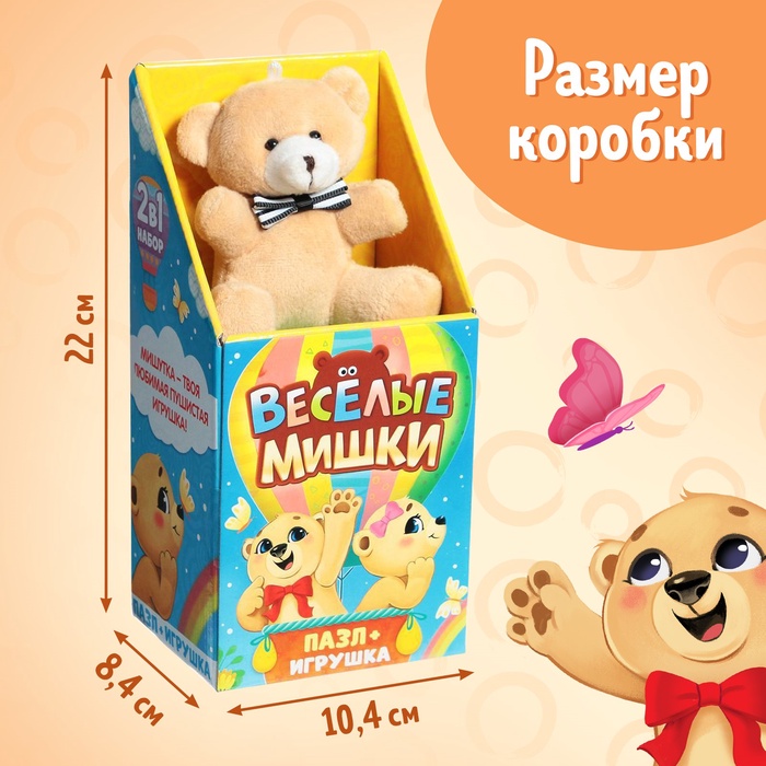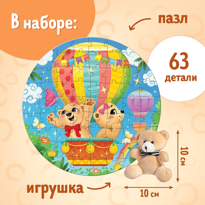 Набор «Весёлые мишки» станет эффектным подарком на любой праздник! В наборе вы найдёте круглый пазл из 63 деталей и мягкую игрушку.