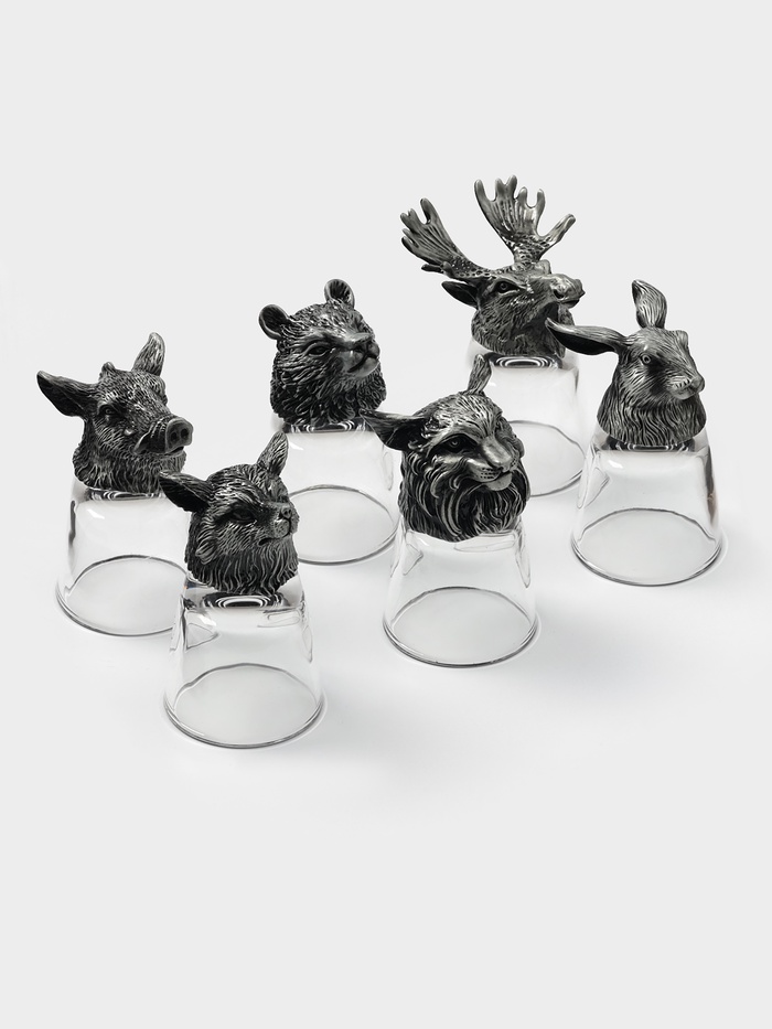 Набор стопок-перевертышей высокого качества с головами животных — оригинальный подарок для охотника, а также будет незаменим на большом дружеском застолье или на охотничьем привале.