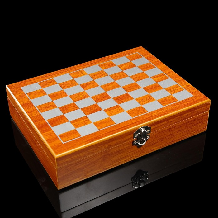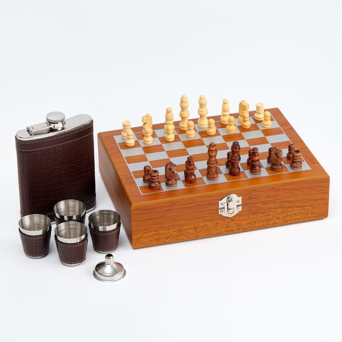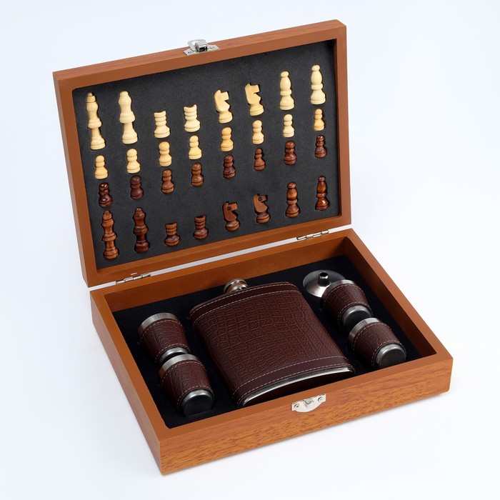Подарочный набор - это универсальный набор, который включает в себя всё необходимое для приятного времяпрепровождения. В нём есть фляжка, 4 рюмки, воронка, шахматы и доска для шахмат размером 18 х 24 см.