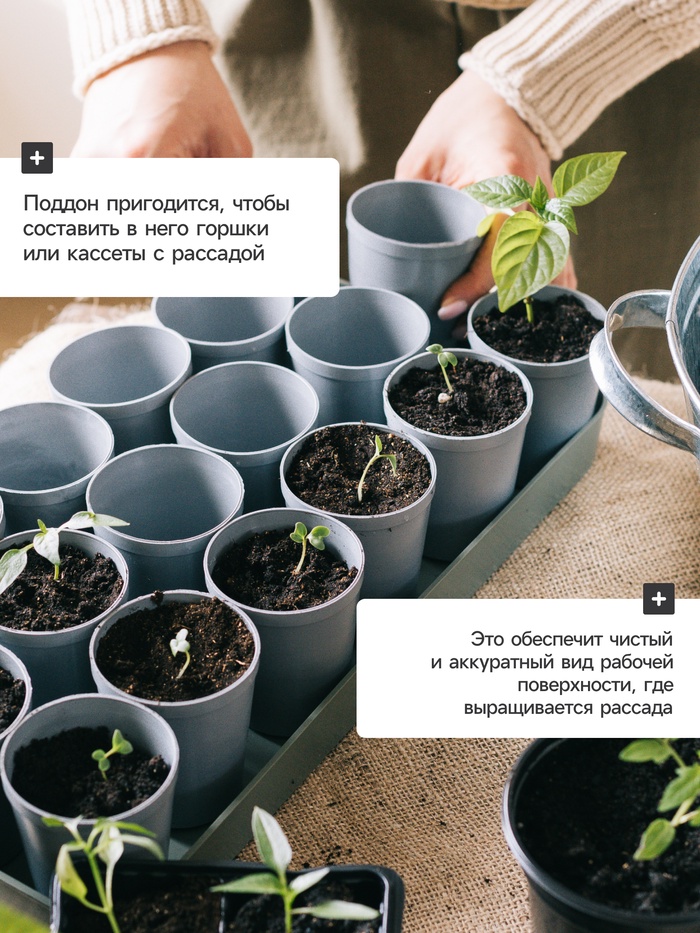 Поддон пригодится, чтобы составить в него горшки или кассеты с рассадой. Это обеспечит чистый и аккуратный вид рабочей поверхности, где выращивается рассада.