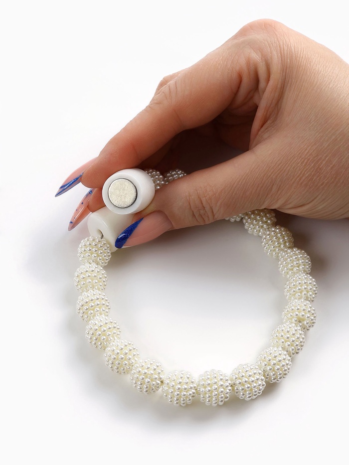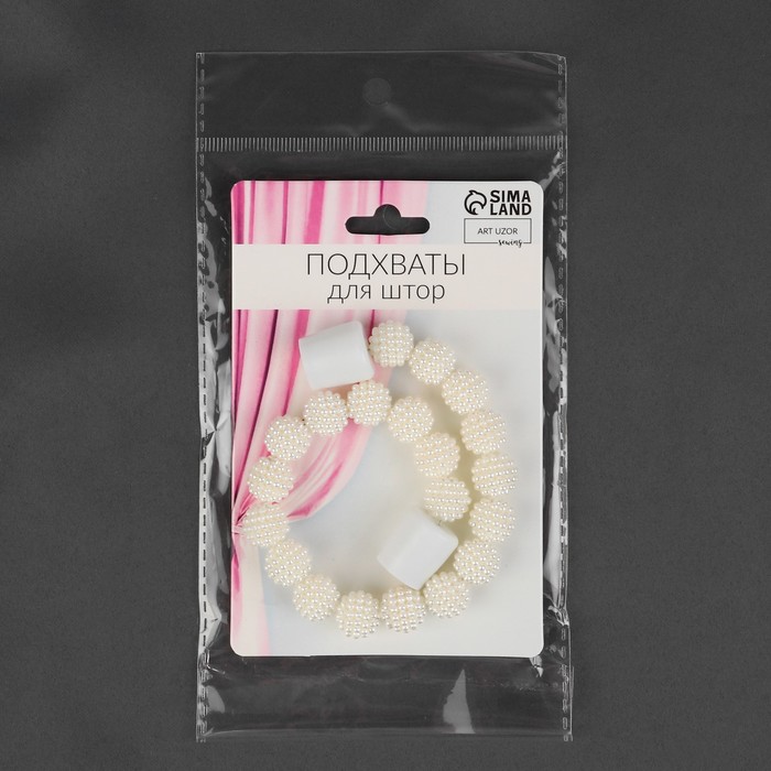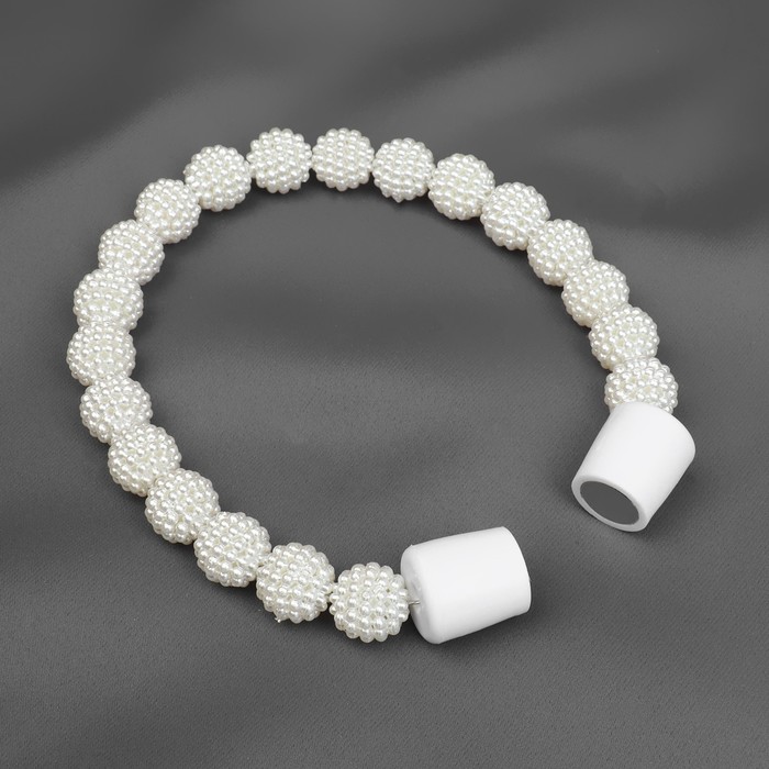 Белый подхват для штор с магнитным креплением и декоративными бусинами на тросе сочетает функциональность и изящный дизайн. Его перламутровый оттенок придаёт оконному оформлению лёгкость и свежесть, подчёркивая текстуру ткани и создавая аккуратные складки.