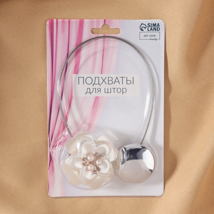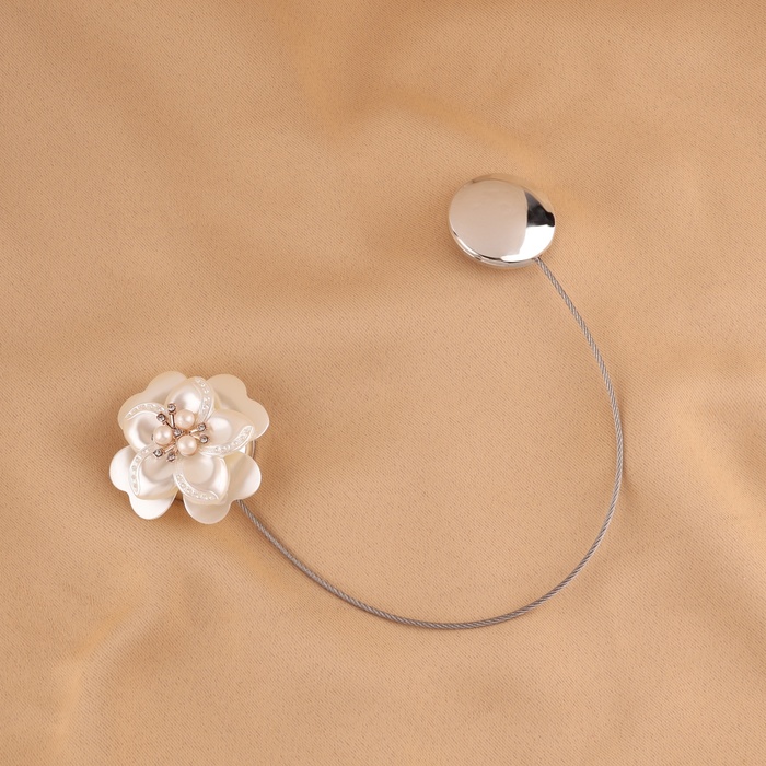 Этот подхват не просто держит штору — он становится частью дизайна окна. Форма цветка добавляет интерьеру нотку женственности и тепла, особенно в светлых гостиных, спальнях или детских. Перламутровый блеск приглушает строгость белого цвета, делая его более живым и естественным. Такой аксессуар легко интегрируется в общий ансамбль, оставаясь одновременно функциональным и декоративным.